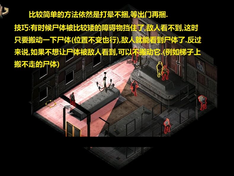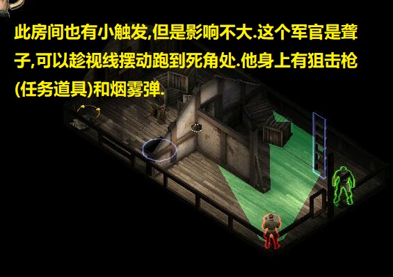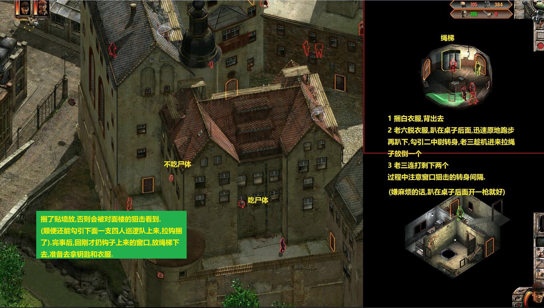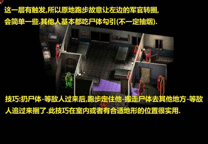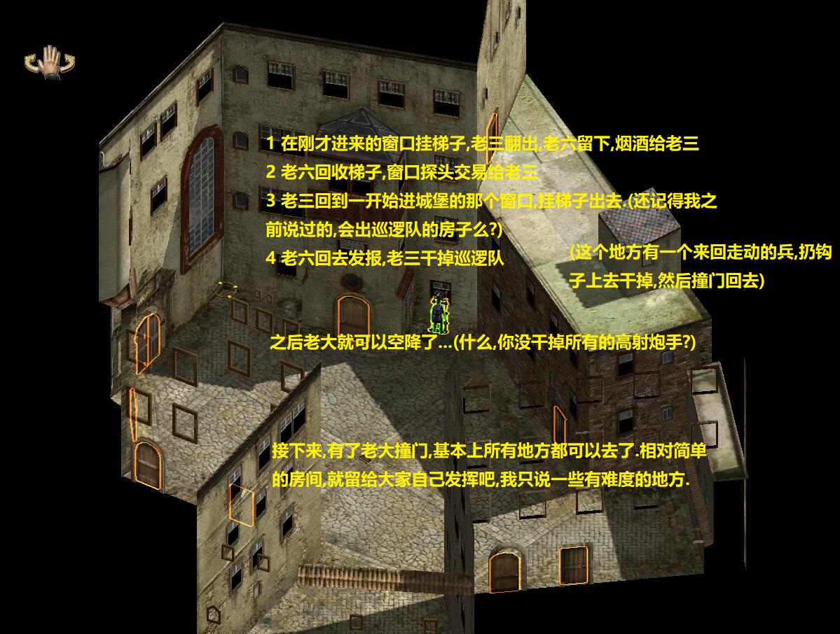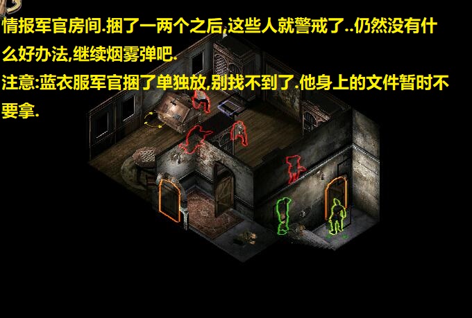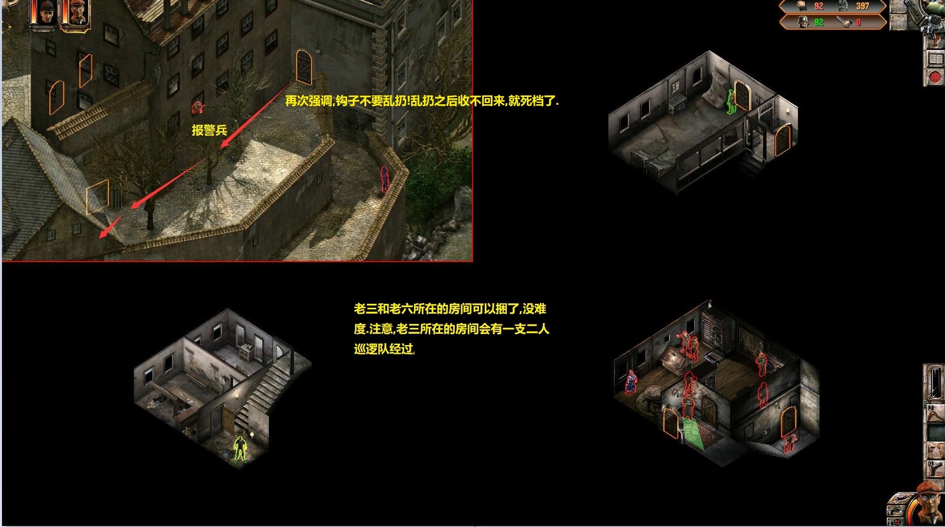 - 有些兵会在房间之间乱窜,而且有的人巡逻路线还很长,容易被忽略掉.所以,在房间里捆人的时候,尽量保留室外或者前一个房间的分屏,不要被爆了菊花.建议一直开着shift+f6,然后没事可以看看数字有没有异常减少.(此技巧适用于各种关卡)