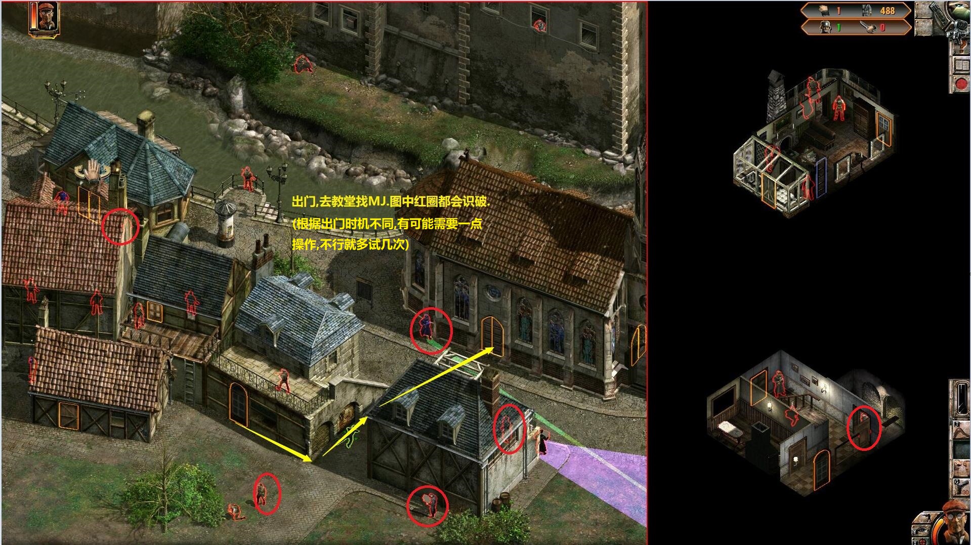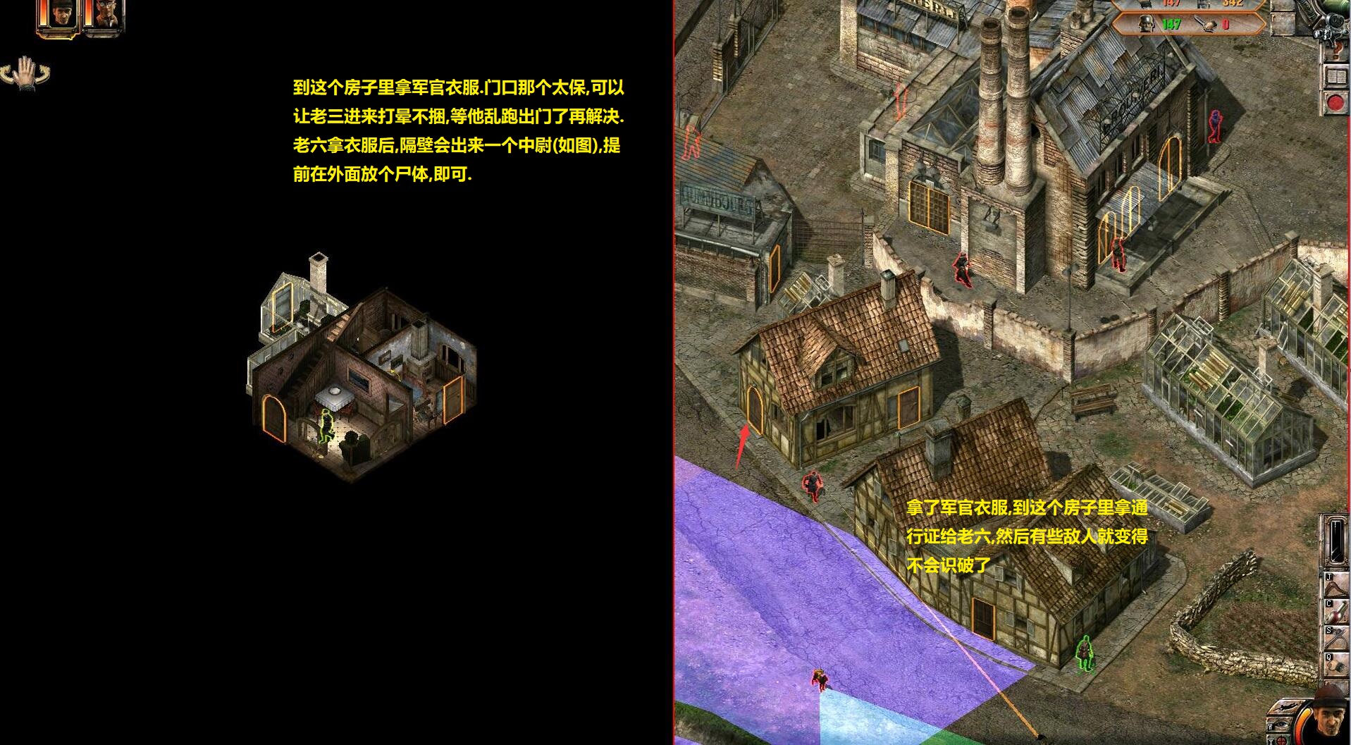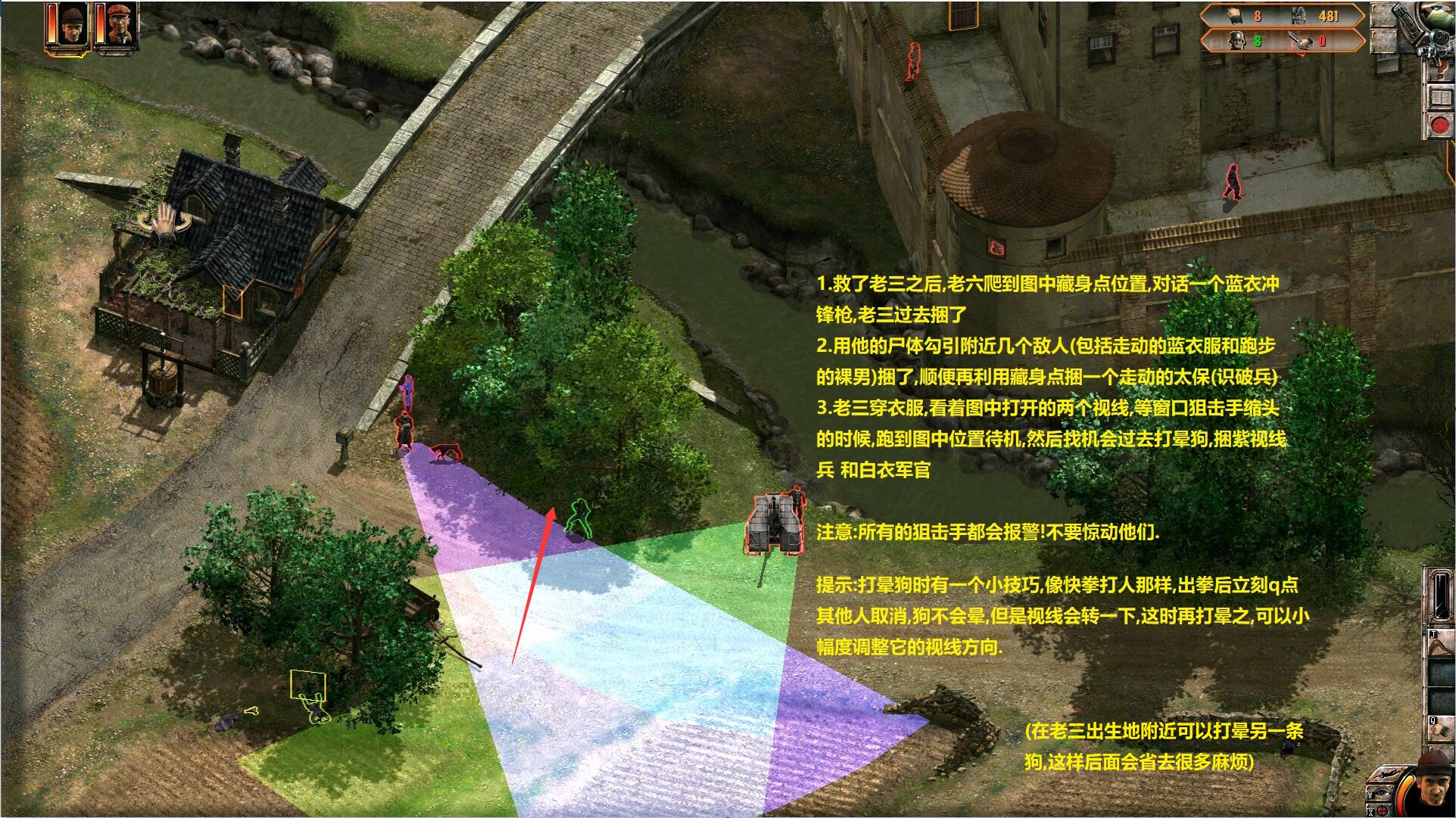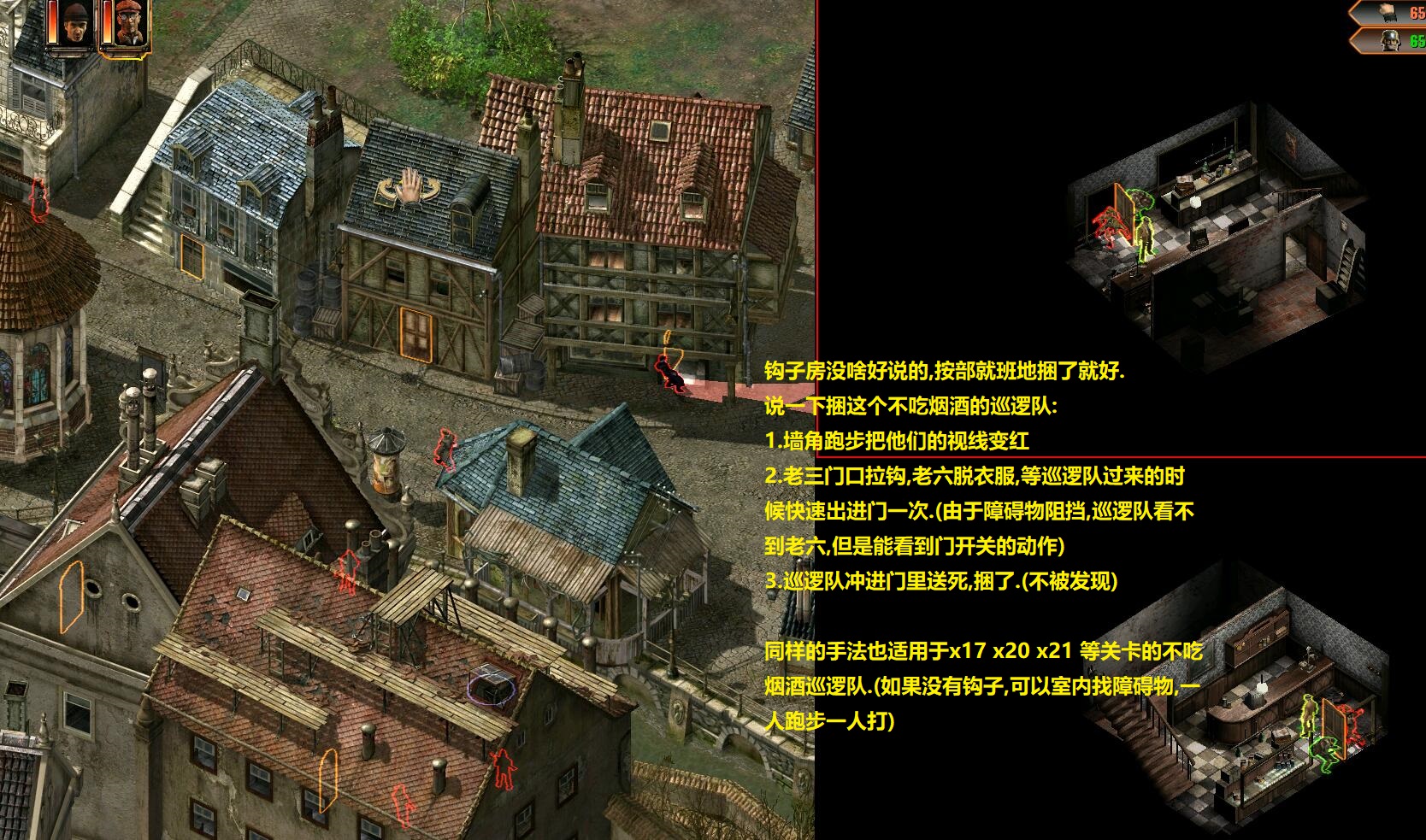 - 有些兵会在房间之间乱窜,而且有的人巡逻路线还很长,容易被忽略掉.所以,在房间里捆人的时候,尽量保留室外或者前一个房间的分屏,不要被爆了菊花.建议一直开着shift+f6,然后没事可以看看数字有没有异常减少.(此技巧适用于各种关卡)