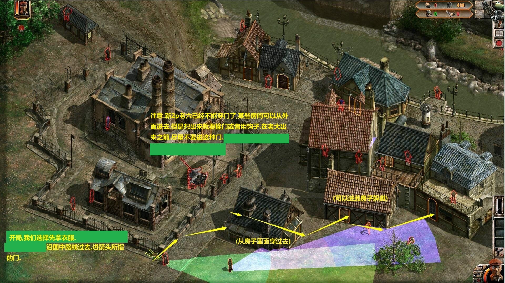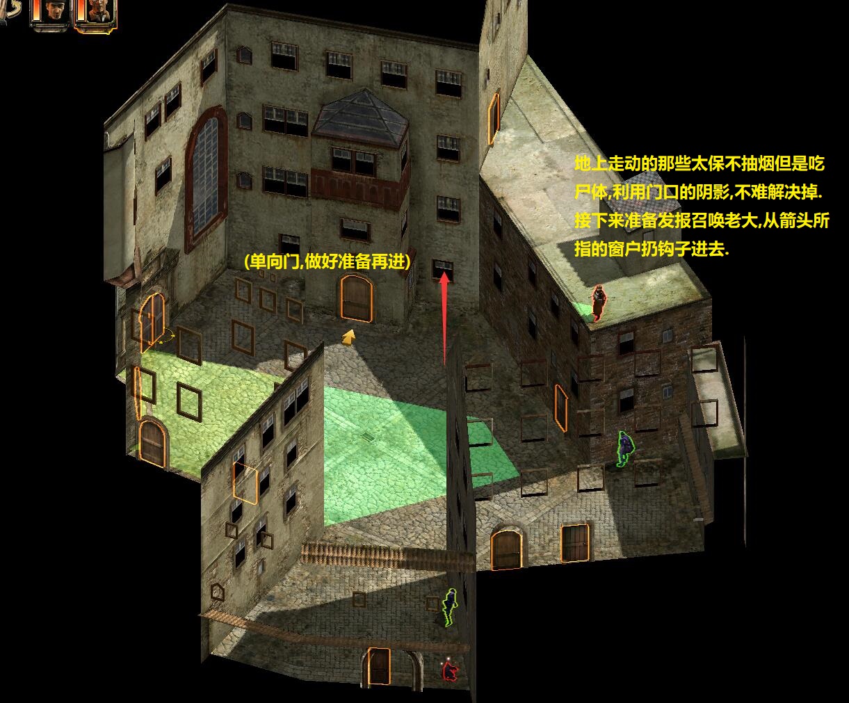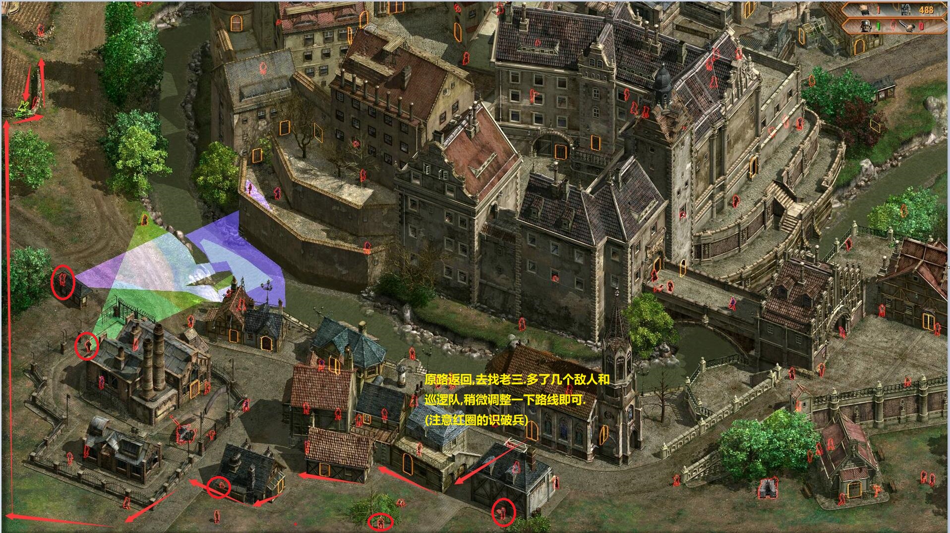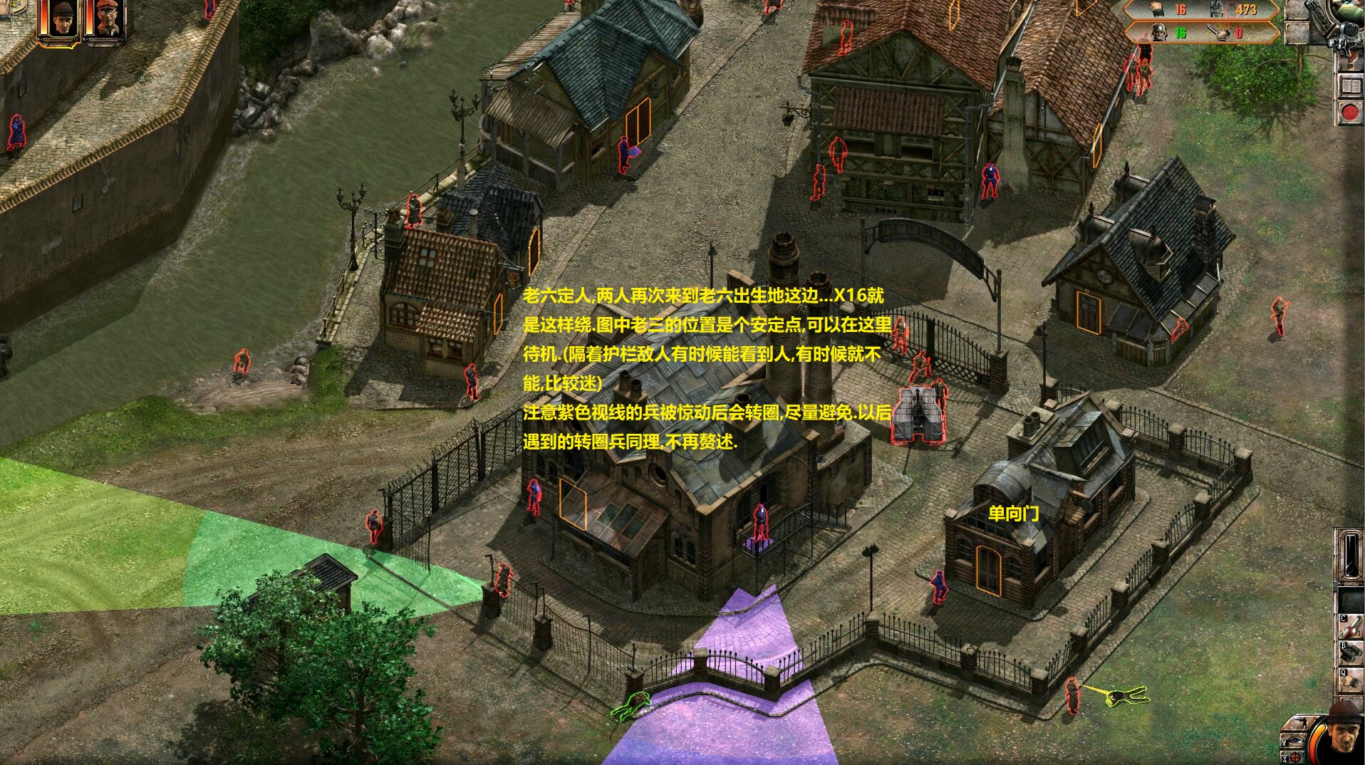 - 有些兵会在房间之间乱窜,而且有的人巡逻路线还很长,容易被忽略掉.所以,在房间里捆人的时候,尽量保留室外或者前一个房间的分屏,不要被爆了菊花.建议一直开着shift+f6,然后没事可以看看数字有没有异常减少.(此技巧适用于各种关卡)