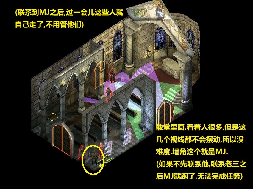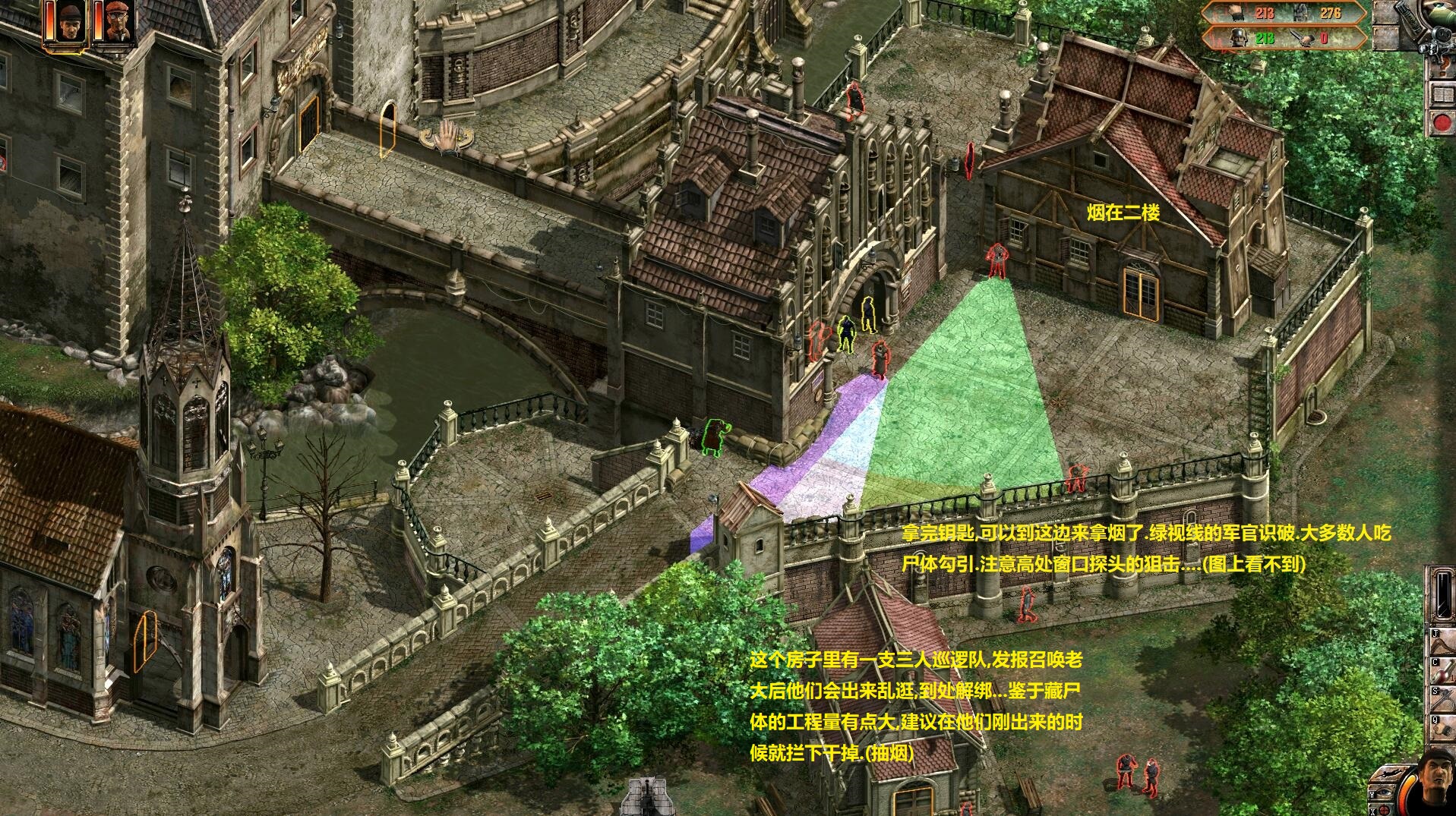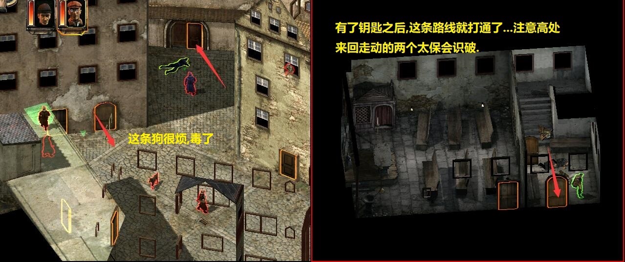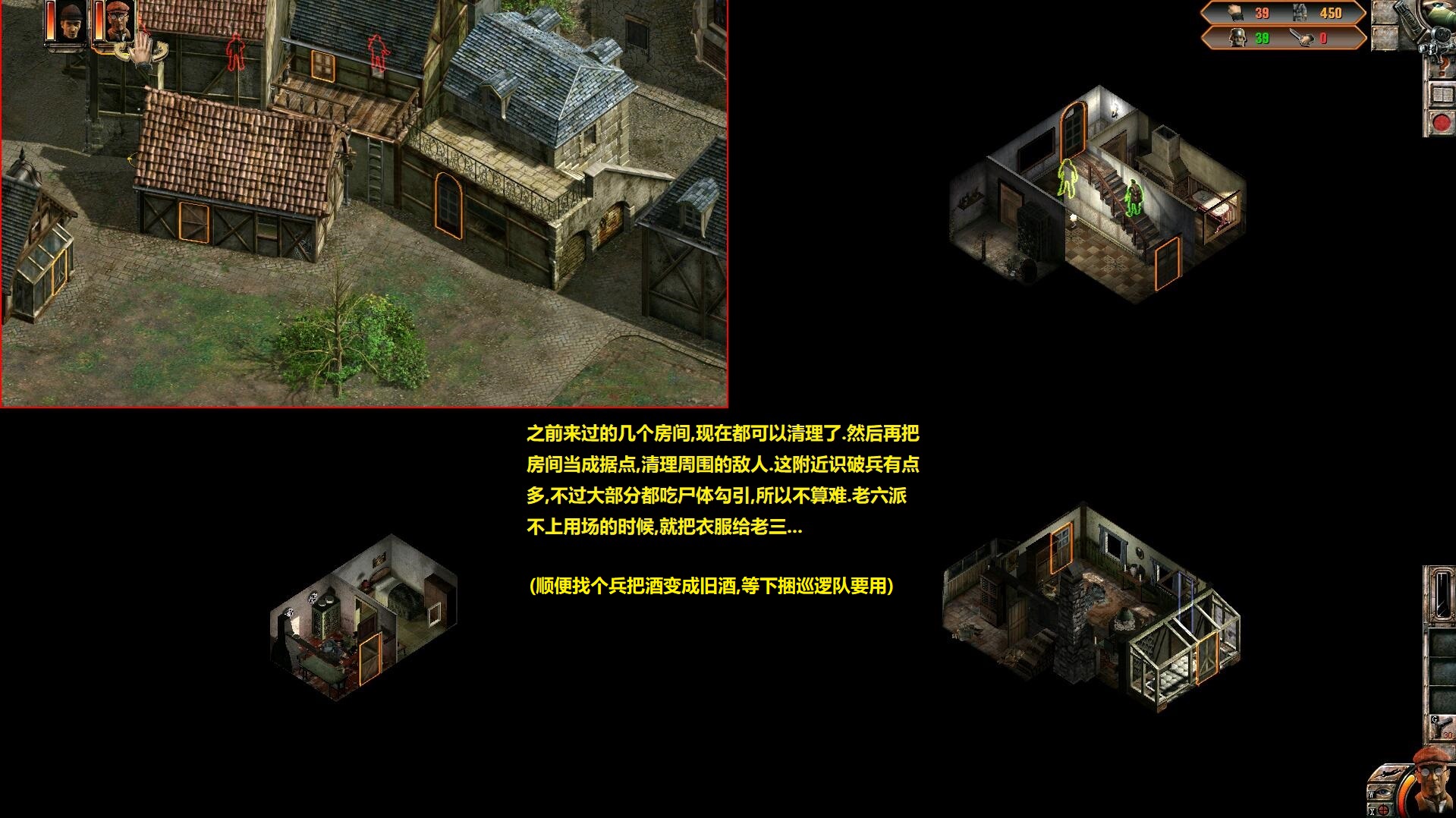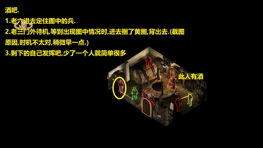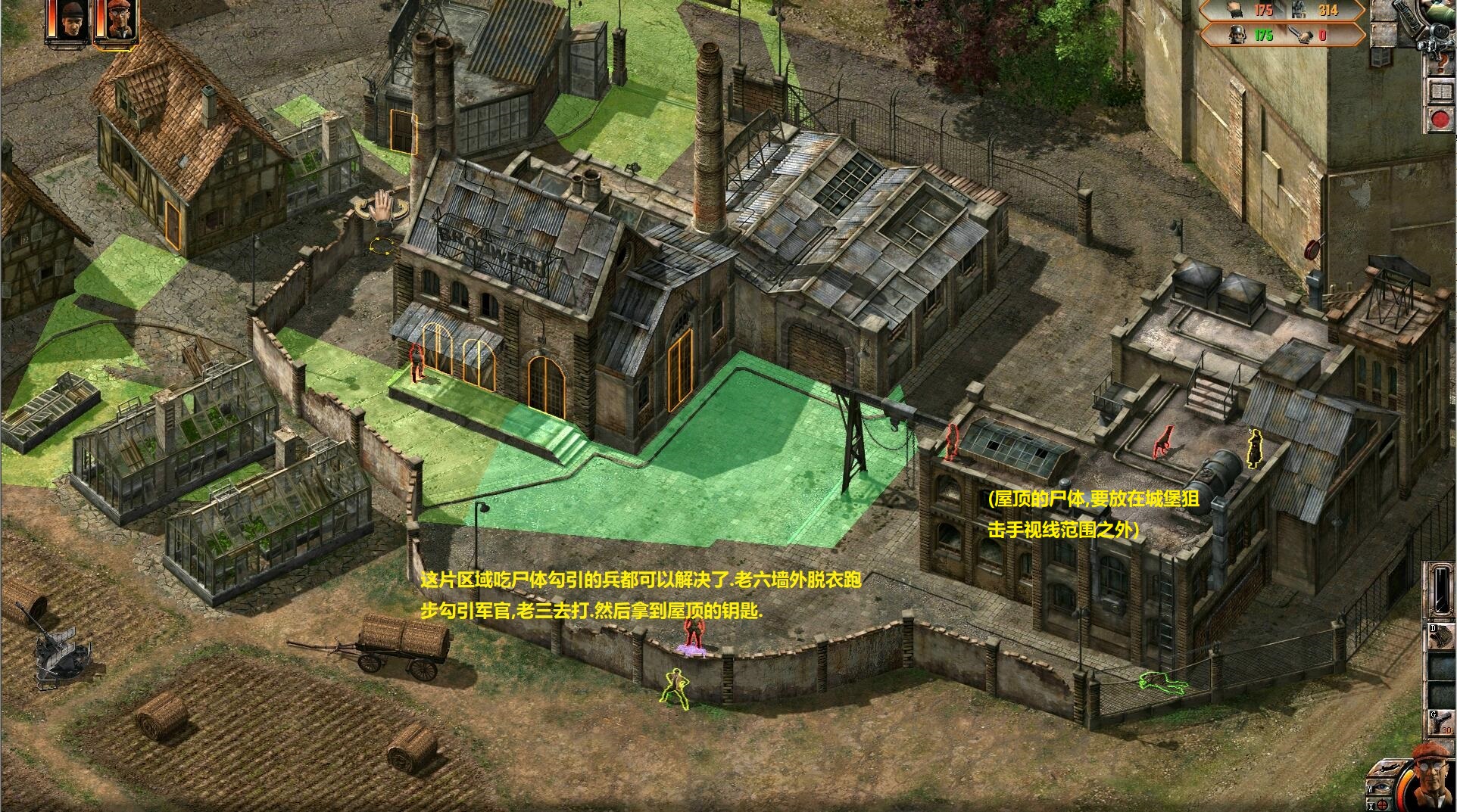 - 有些兵会在房间之间乱窜,而且有的人巡逻路线还很长,容易被忽略掉.所以,在房间里捆人的时候,尽量保留室外或者前一个房间的分屏,不要被爆了菊花.建议一直开着shift+f6,然后没事可以看看数字有没有异常减少.(此技巧适用于各种关卡)